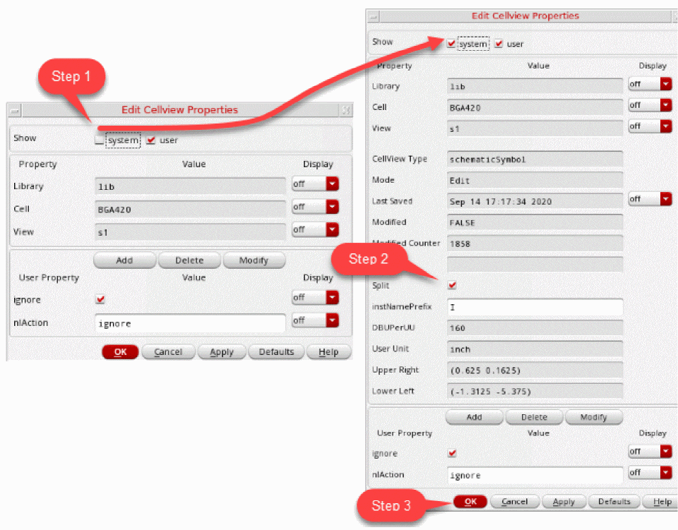 Every split component has an attribute, Split Primary, which specifies the name of the primary instance they are merged into. The Check – Current Cellview command ensures that the signals on the split components are carried through to the component pins of the invisible split-primary. The properties and CDF parameters for the component are stored on the split-primary symbol.
