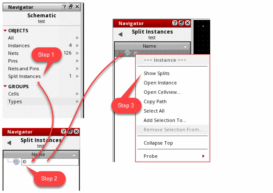 - Click the Split Instances set under the Objects category in the Navigator Assistant. This set lists all the split-primary instances in the design.
