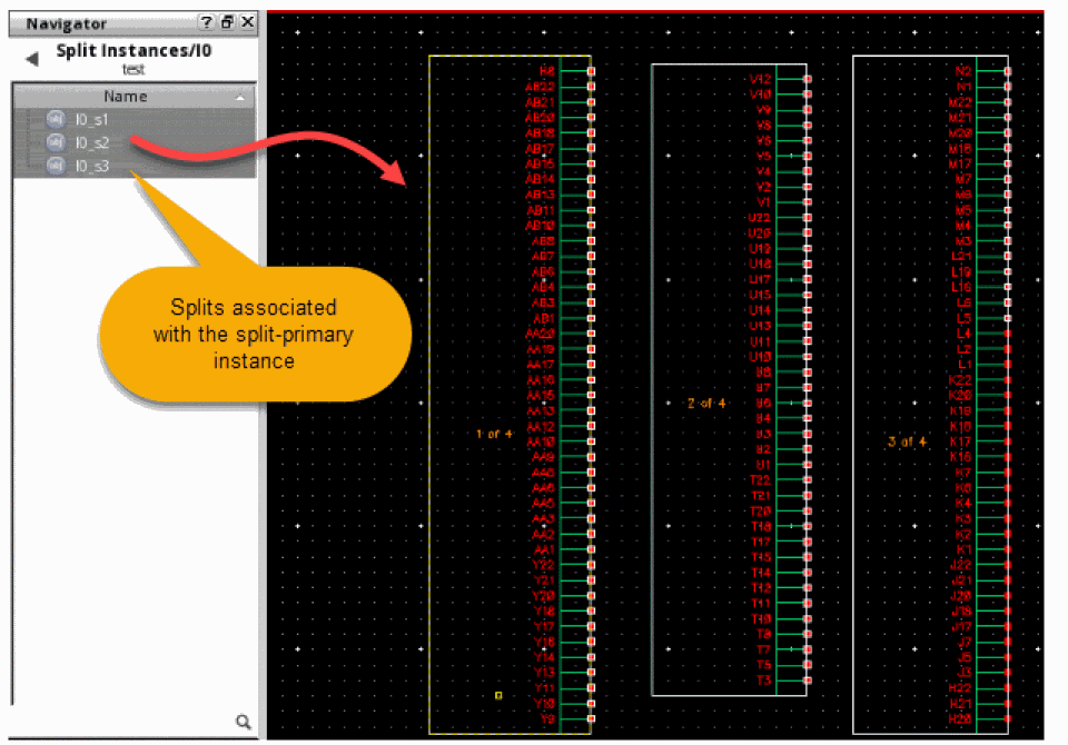 Large symbols that have hundreds of pins are difficult to manage within a schematic design. The Split Symbols feature in Virtuoso Schematic Editor lets you split a large symbol into multiple partial symbols. Splitting such a large symbol master allows the schematic to be more readable and have a legible presentation of the pin symbols. This feature is most useful for PCB and package schematics.