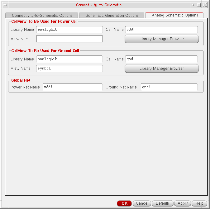 - Click OK or Apply on the Connectivity-to-Schematic tab to generate an analog schematic