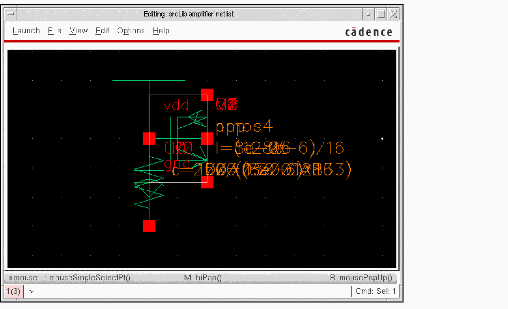 The following figure shows the netlist view of the amplifier cell existing in the srcLib library: