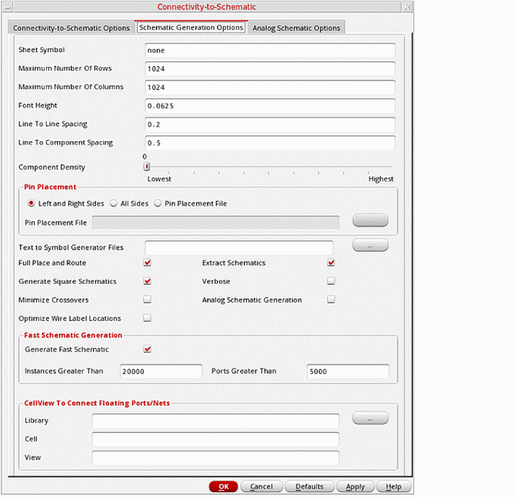 The following table lists the fields in the Fast Schematic Generation group box, with their default values and environment variables.