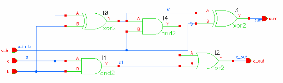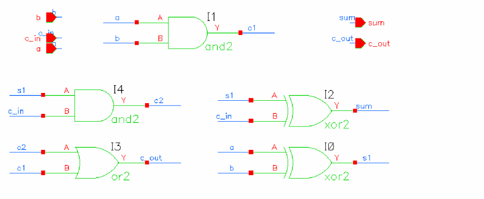 Turn this option off to generate a schematic in which the nets are not explicitly connected. In such a schematic the nets are not wired and the connectivity is indicated by name. This type of schematic is useful for importing large designs where the primary focus is in creating a netlist and simulation and not viewing the design. In addition, generating such a schematic is much faster than generating a completely routed schematic as a significant amount of run-time is spent during routing. The following figure shows a schematic in which the nets are not explicitly routed: