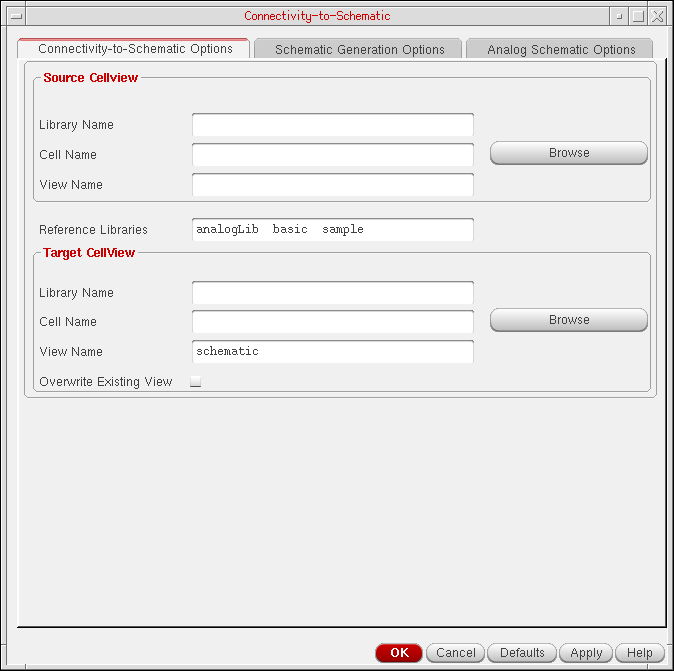 - Specify the names of a source library, source cell, and source view in the appropriate fields on Connectivity-to-Schematic Options tab.