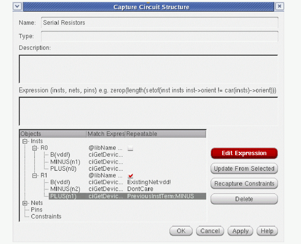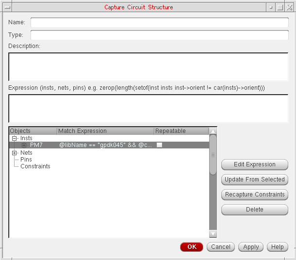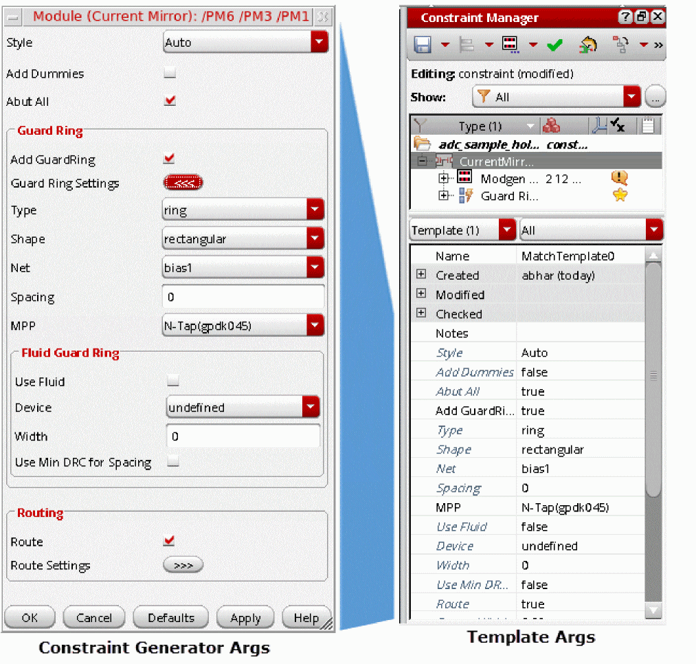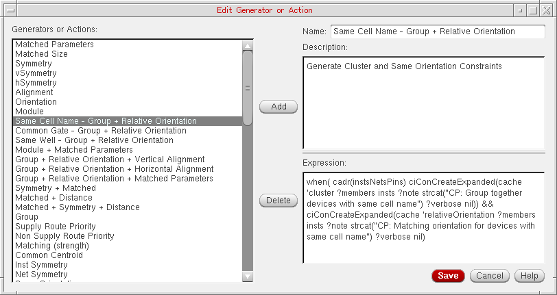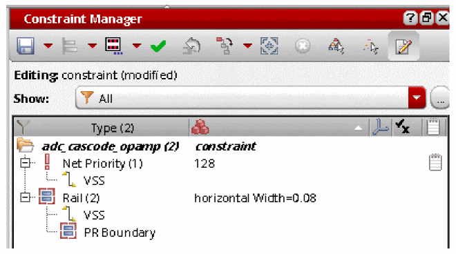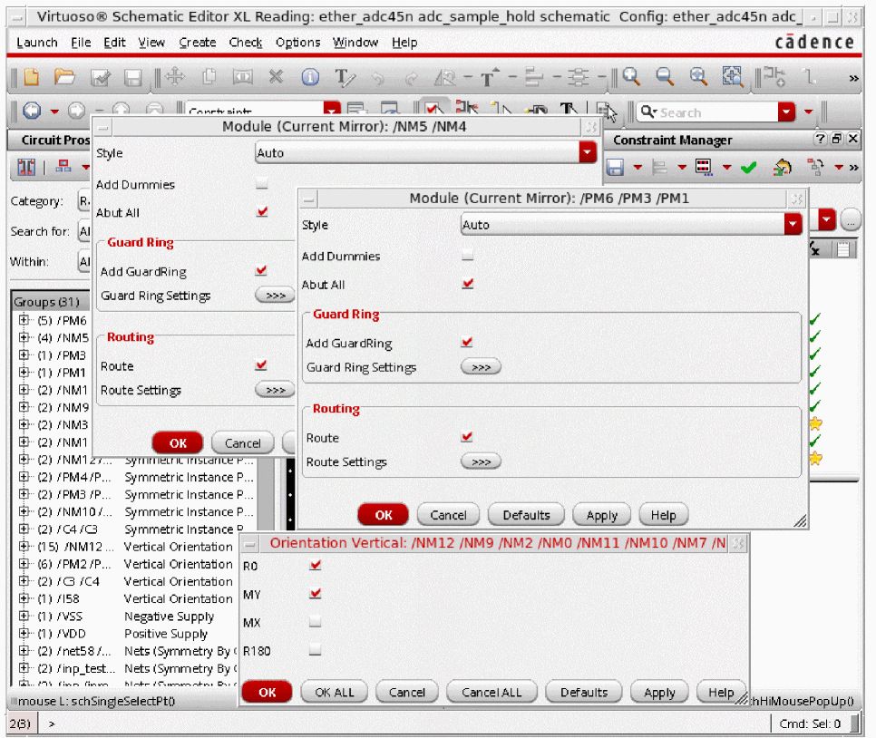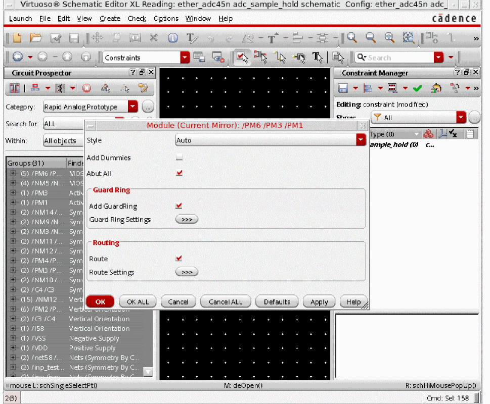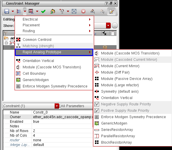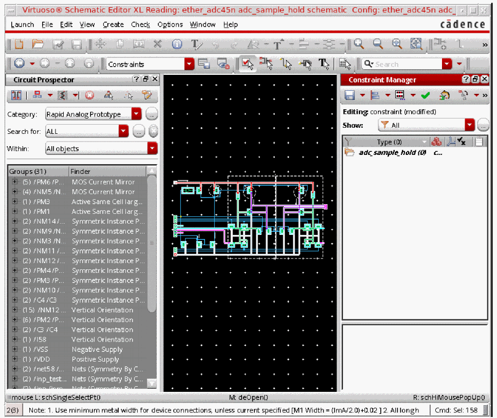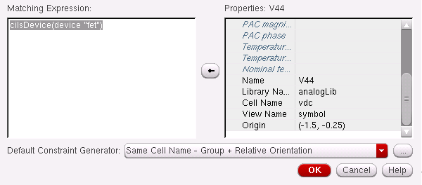 In general, designers will want to apply a set of constraints to common circuit structures, related devices (such as same size, area, or type), devices with particular characteristics/connectivity, or symmetrical devices/nets/pins with particular properties.