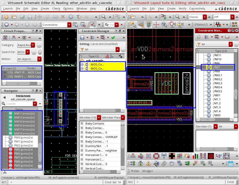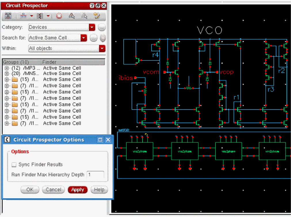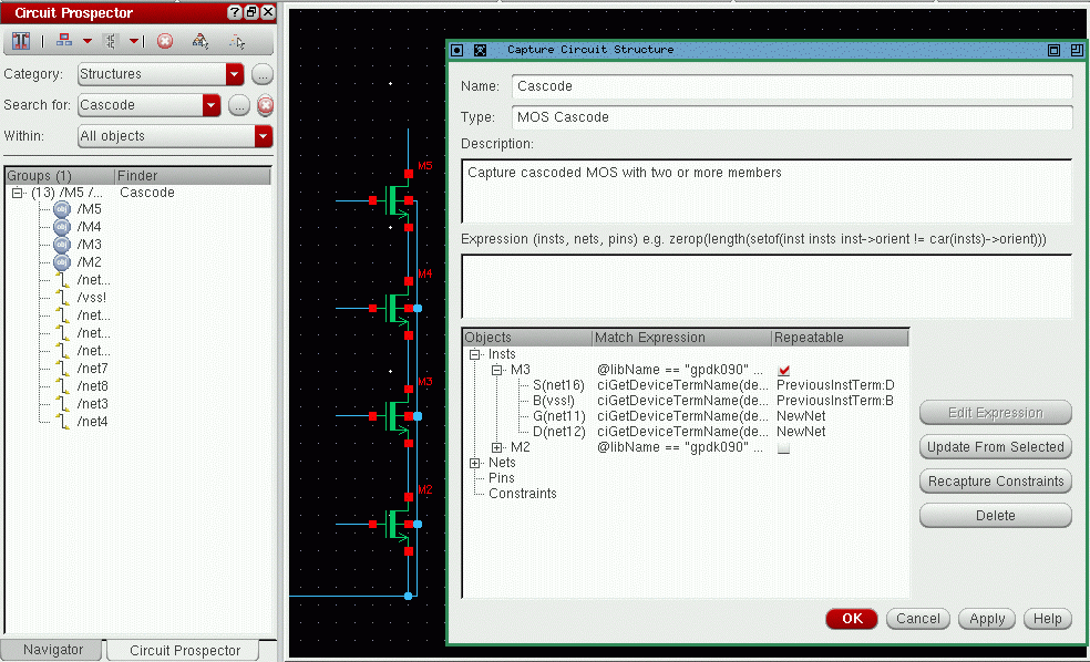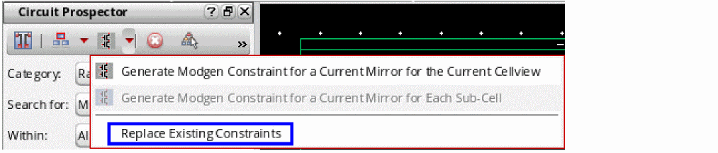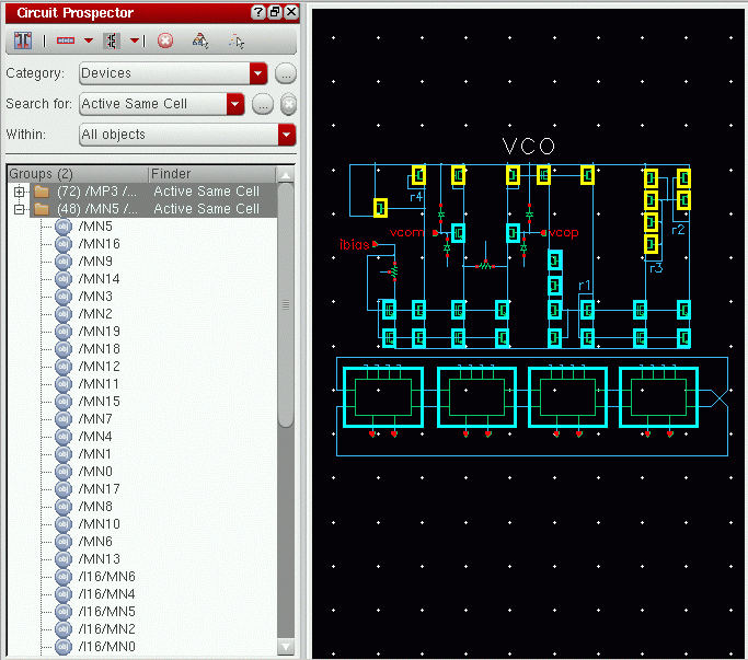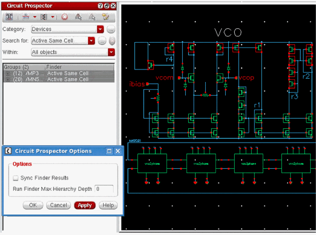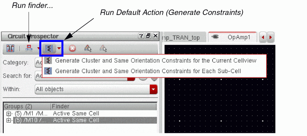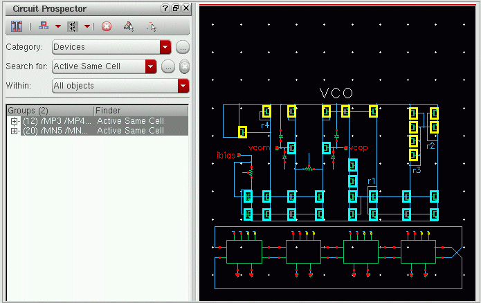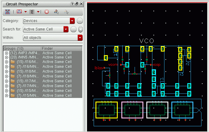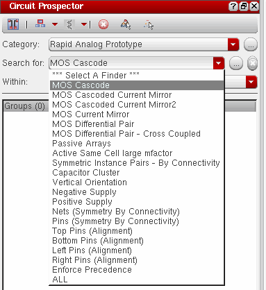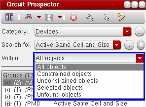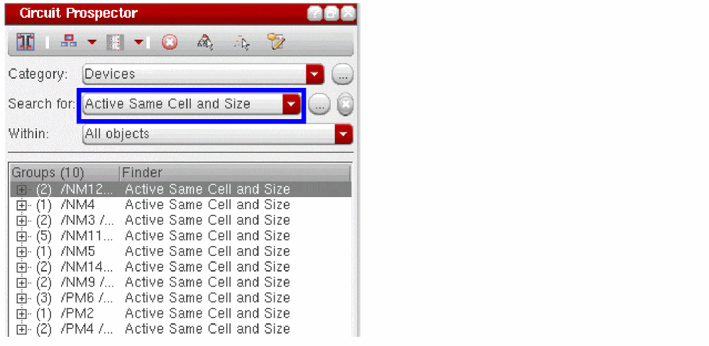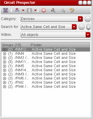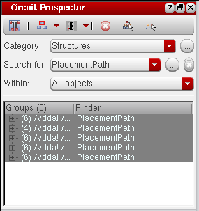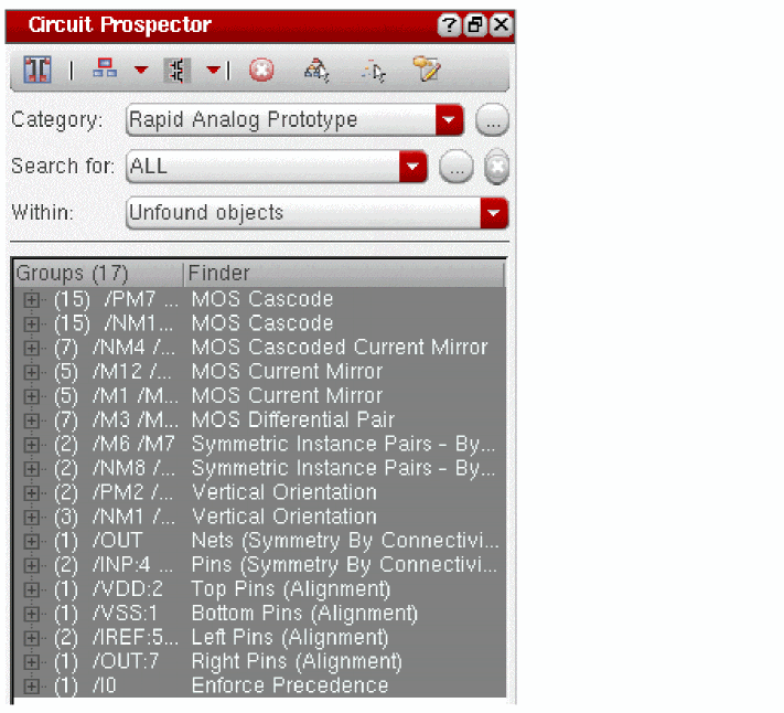 The Circuit Prospector assistant can be used to detect circuit structures, devices and nets based on certain criteria, and optionally apply a default set of constraints to them. It can also be used to set properties, or to visualize various groups of objects; acting as an additional search facility. Moreover, it can also be used for debugging, and to also apply specific actions to selected results.