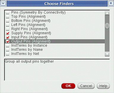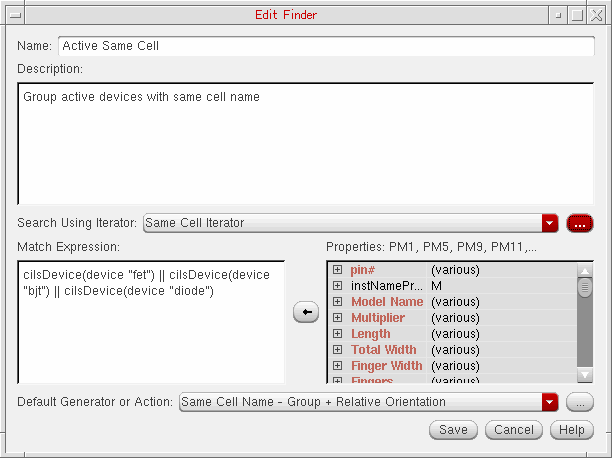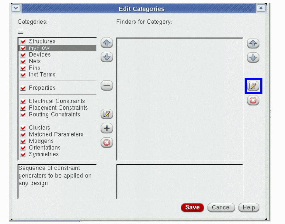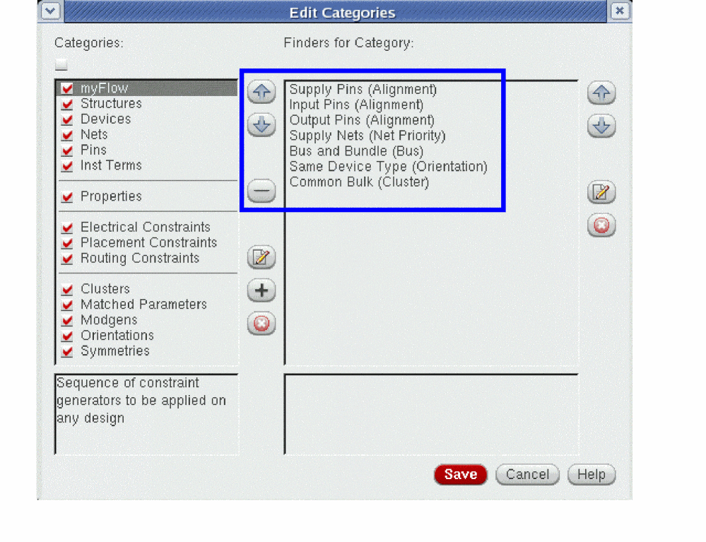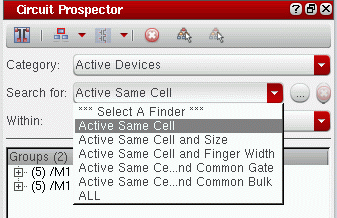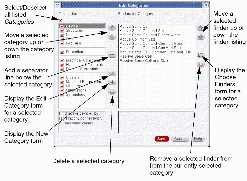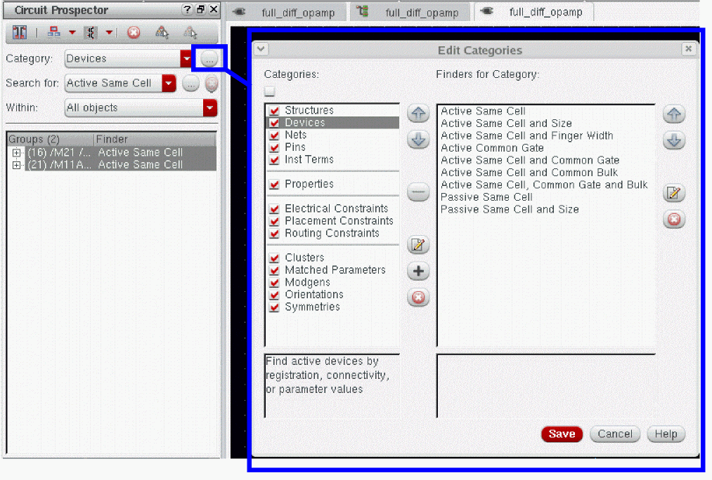 A Category comprises of a collection of related Finders that are search routines to look for devices, pins, or nets that meet certain criteria, for example, common circuit structures, related devices (same size, area, type, or shared connectivity), devices with certain characteristics or shared connectivity, symmetrical devices with particular properties and so on.