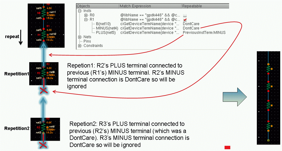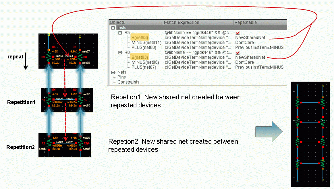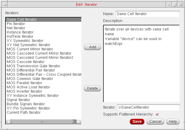 Iterators are SKILL functions that analyze cellview devices, nets, and pins in a variety of ways, for example, you can iterate all selected objects, instances, or symmetrical devices.