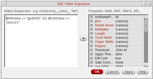 To the right of the expression entry area is a property display area which lists all of the properties of the currently selected objects in the design canvas.Right-clicking over this table will display a context-menu which enables you to re-arrange the table display. For example, you can choose to View by Property or View by Object, Expand All or Collapse All of the properties displayed, or choose to move to the Next or Previous selected property.Figure 2-21 Matching Expression section of the Edit Finder form