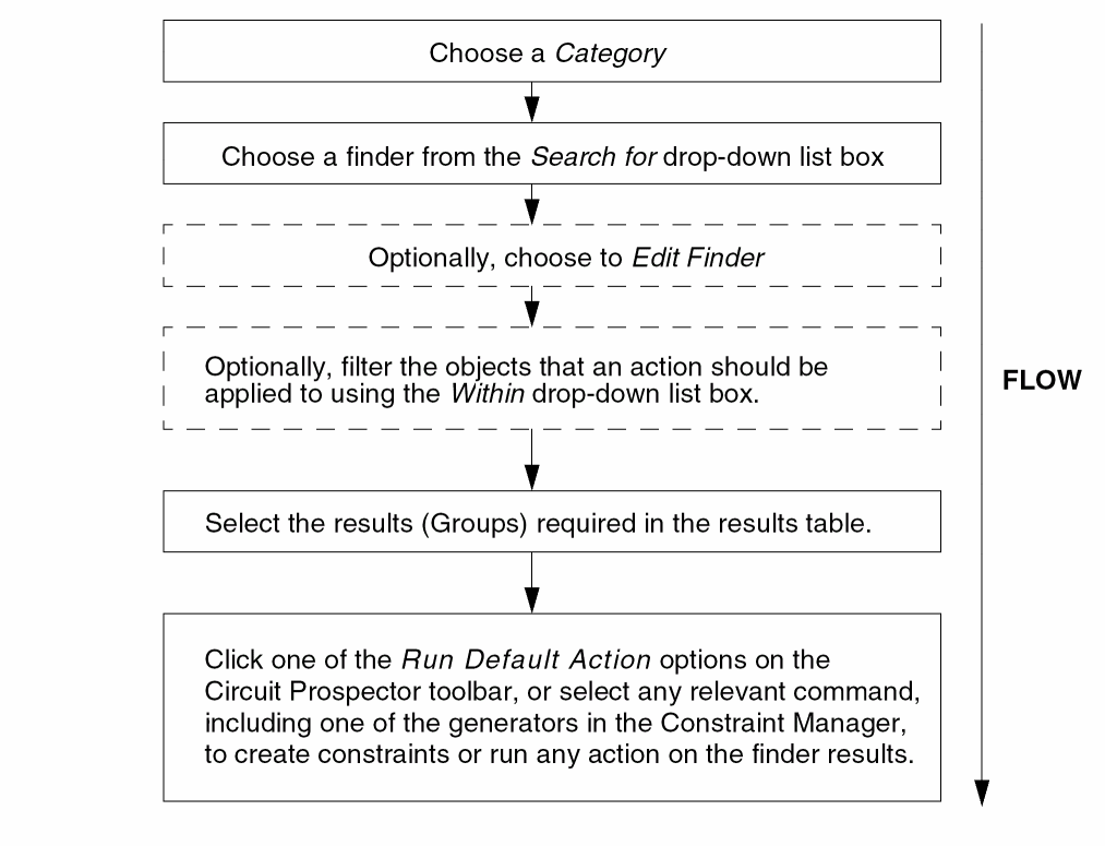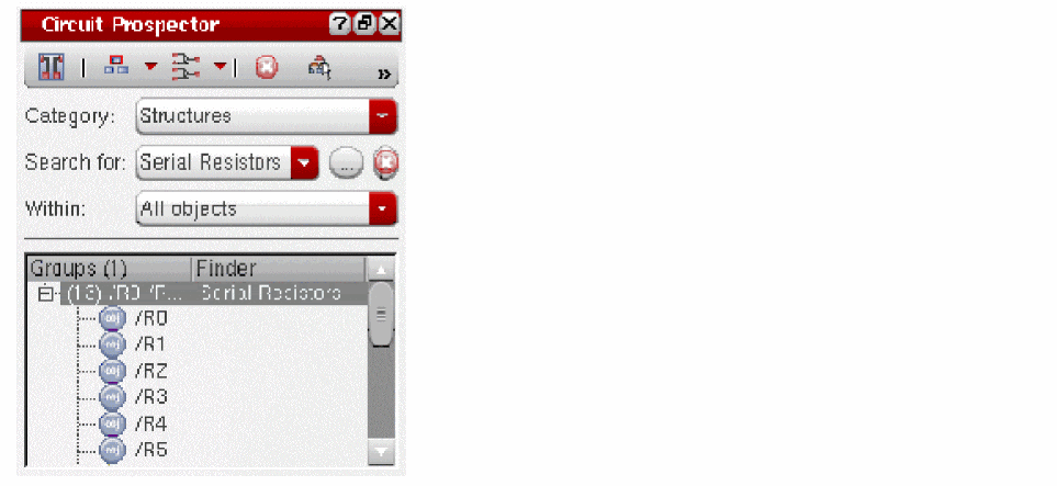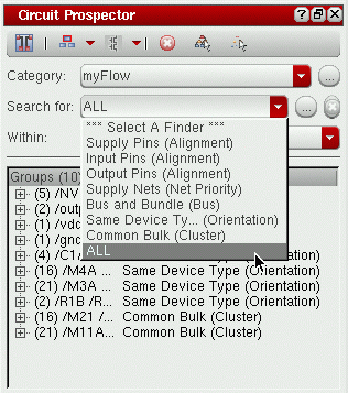 The Circuit Prospector provides a set of common structure finders that can be modified by the users to suit their design needs. Users can also create their own finders or capture any structure in the design and save it as a custom finder. The finders are grouped together in 'Categories' that can be customized as well. (See Creating and Editing Categories and Creating Finders).