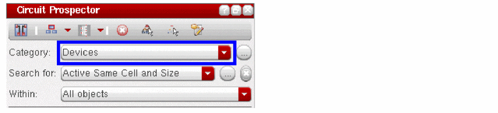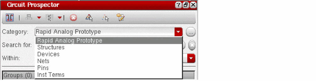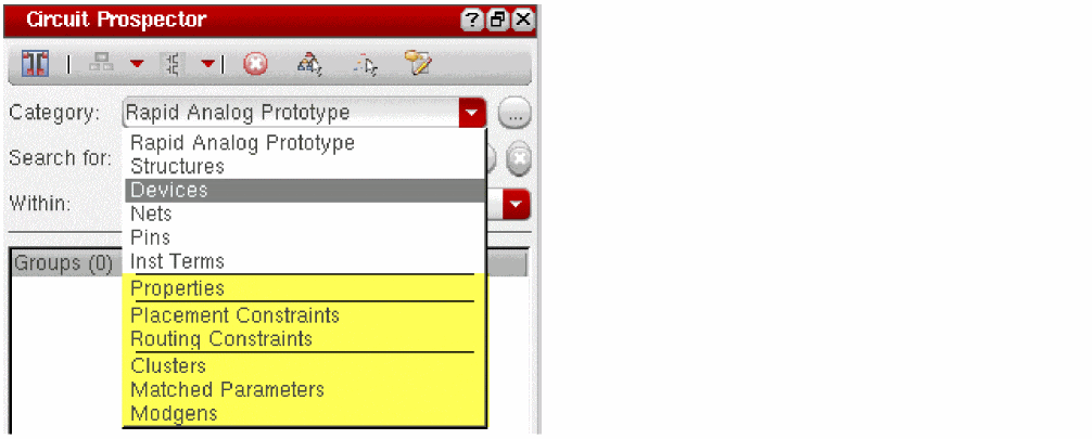 The second component of the Circuit Prospector, right under the toolbar, are a set of drop-down list boxes to select categories of constraints, apply finders, and choose those objects to be constrained. The drop-down list boxes are: