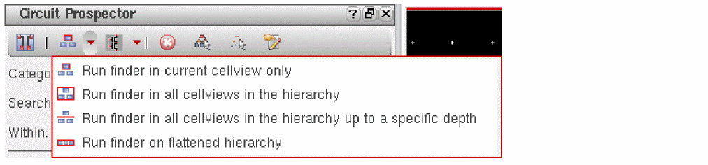 Runs the finder on the current cellview and all other cellviews in the hierarchy that are below the current cellview up to the maximum depth specified in the Run Finder Max Hierarchy Depth field on the Circuit Prospector Options form.