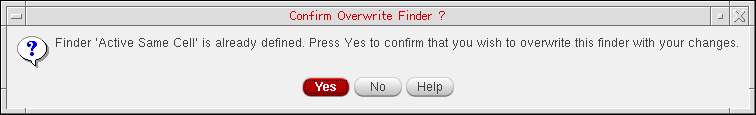 Optionally, in the Matching Expression section, edit the SKILL expression which the iterator applies as it iterates over cellview objects.If an expression returns a positive value the current set of iterated objects will be collected and returned once the iteration is complete. The current set of iterated objects may be a single object or a set of objects, dependent upon the iterator selected.If you make any changes in the SKILL expression and click the Save button, the Confirm Overwrite Finder? dialog box is displayed asking for the confirmation to override the SKILL expression, as shown below.