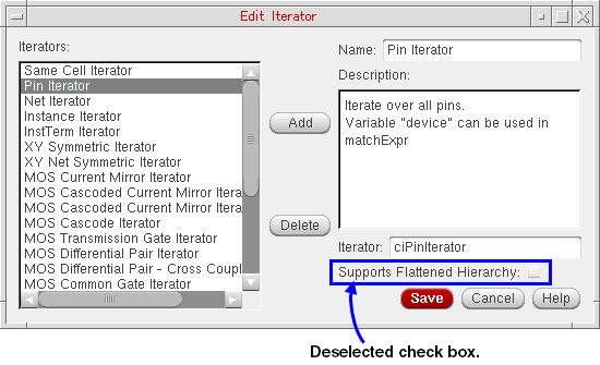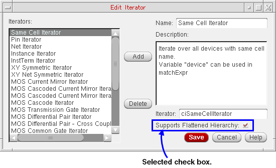 The Iterator SKILL function name is the name of the SKILL function that is to be called to perform the iteration. The function takes a cellview (as an object ID) and a matching expression (as a string of characters) as arguments, where the cellview is the current cellview and the matching expression is the matching expression that has been defined for the finder that will call this iterator (see Creating Finders). The function returns a list of object lists that satisfy the matching expression while iterating through the passed cellview. - Specify whether or not the iterator Supports Flattened Hierarchy.