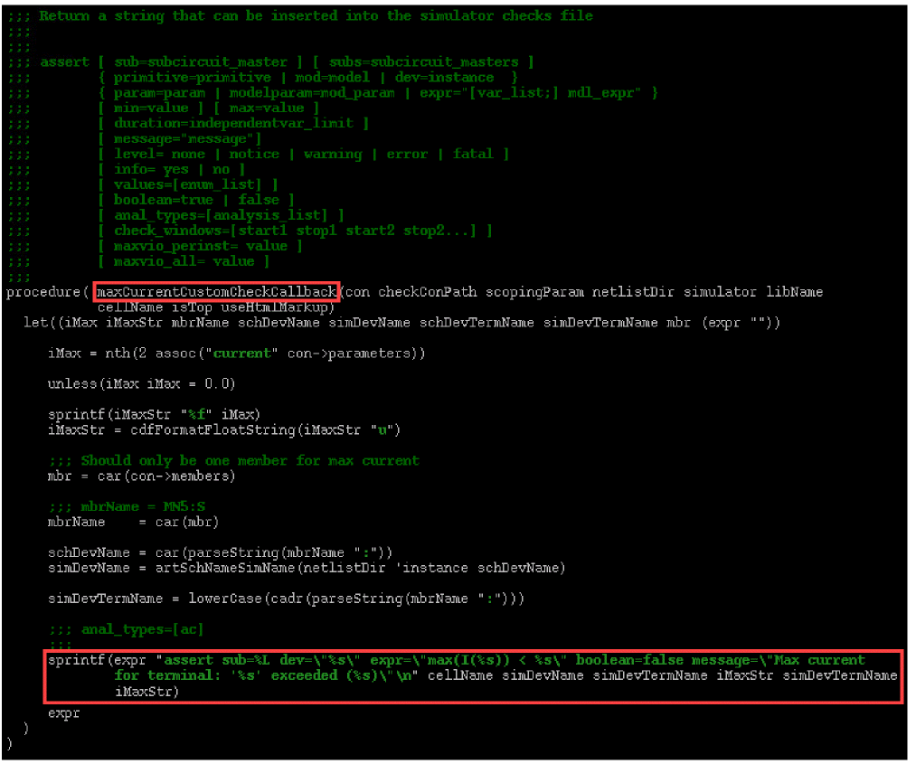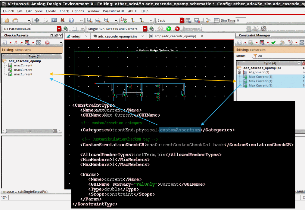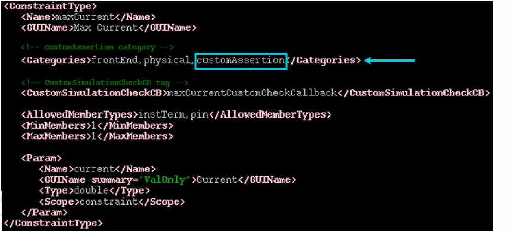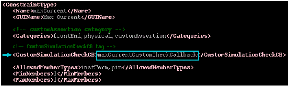 In addition, you can specify a custom callback, as shown below, in the config.xml file to allow the constraints to be netlisted as Spectre asserts along with the existing checks and asserts.