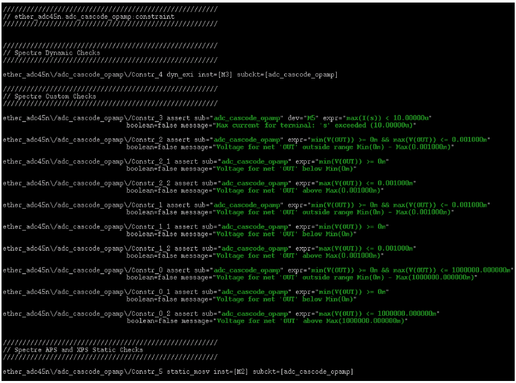 The following image illustrates how the constraints are netlisted as Spectre assert statements: