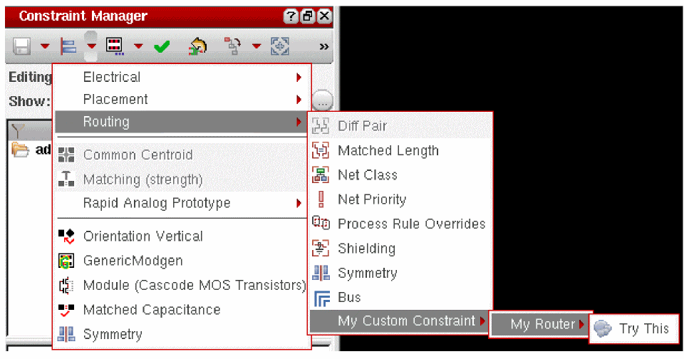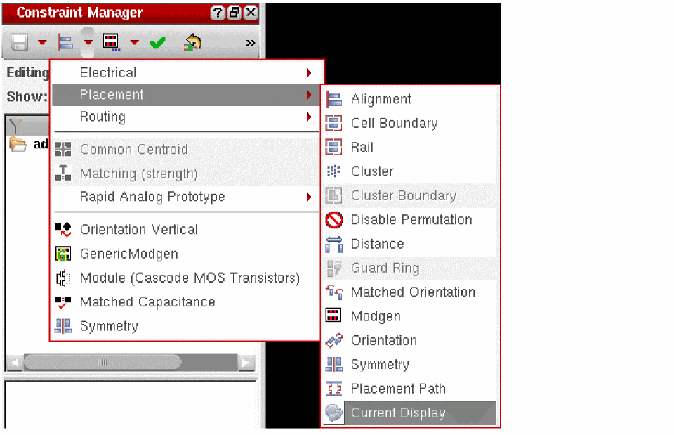 Specify the name of a submenu that already exists in the Constraint Generator drop-down menu. The new constraint type will get added as an option below that submenu. For example, if the new constraint type, Current Display, should be displayed in the existing Cadence-provided submenu, Placement, specify the following: