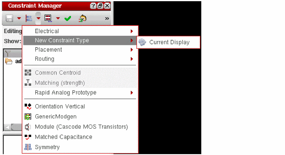 If the specified submenu does not exist, a new submenu by the given name gets created the Constraint Generator drop-down menu and the constraint type gets added below it. For example, if you want a new submenu, New Constraint Type, where the new constraint type, Current Display, should be displayed, specify the following: