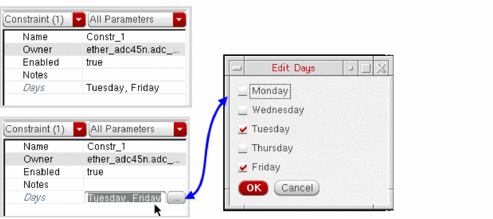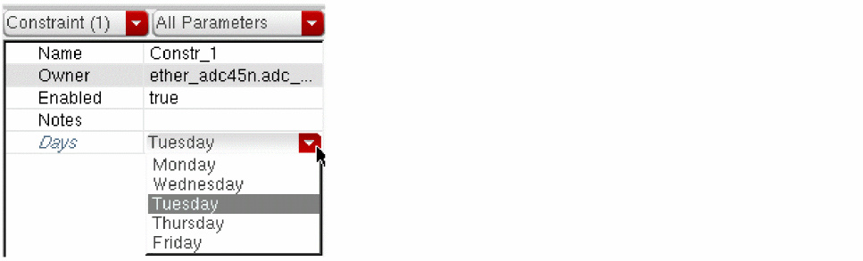 In addition to creating new constraint types and its associated parameters, you can use a config.xml file to control their display in the Constraint Manager assistant. For example, you can rename a constraint type, hide a constraint type from the Constraint Generator drop-down menu, or control the display format of a constraint parameter.