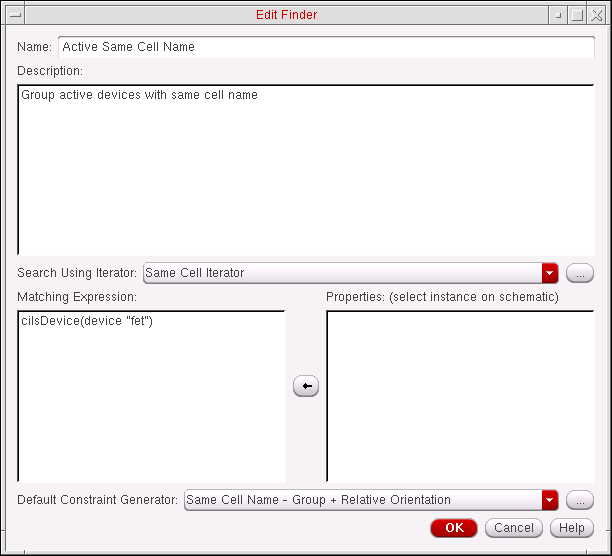 When you select ALL, from the Search for pull-down list, an internal procedure scans the current schematic and lists all found groups in the order of the finders listed here. When you then select all the found groups and apply the default constraints (by selecting Create Default Constraints from the constraints pull-down in the Constraint Manager), the corresponding constraints will be set in the order of the selected groups in the Circuit Prospector.