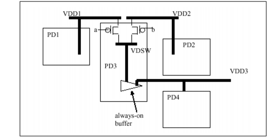 This domain can be powered down by an on-chip power or ground switch. This domain gets its power supply from another domain through a power switch network.
