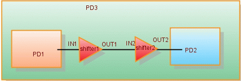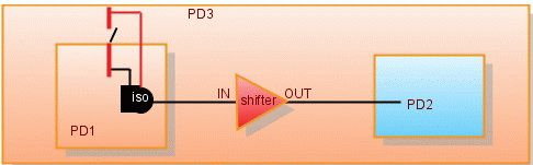 ISO--belongs to PD3, the secondary domain of ISO). The output pin OUT belongs to the output domain of the level shifter which is PD2 (see Input and Output Domains of Level Shifters).The following example has a back to back level shifter implementation from PD1 (0.8) to PD2 (1.2). The level shifters are located in domain PD3 (1.0). The first level shifter was defined with