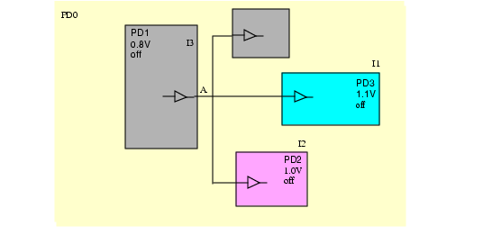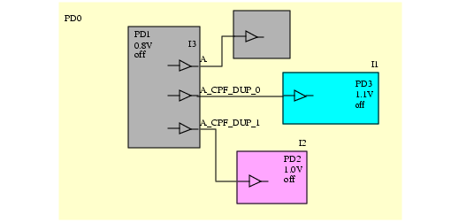 PD1operates at 0.8v. Power domainsPD2andPD3operate at 1.0 and 1.1 volt, respectively.Figure 6-3 Nets with Fanouts in Different Power Domains