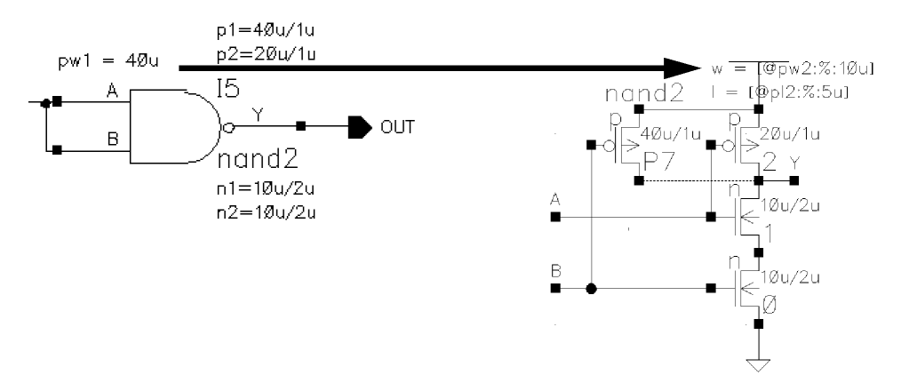 For example, at the current level of a design, there is a two-input NAND gate instance. A NAND subcircuit consists of two NMOS transistors and two PMOS transistors. A parameter of the NAND instance at the current level, pw, is inherited down to the lower-level parameter w of the pmos instance in the inverter schematic. To make this possible, type the expression [@pw:%:10u] as the value of the parameter w of the pmos instance in the inverter schematic (where 10u is the default value of pw). The parameter w is created as an nlpExpr type of a DFII property.