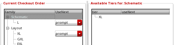 By default, the Current Checkout Order pane displays all applicable tiers for each product family. However, you can choose to deselect a tier and remove it from the current checkout order list by dragging and moving it to Available Tiers.If there is only one tier in the family tree, you are not allowed to remove it from the Current Checkout Order list by dragging and moving it to Available Tiers list, because a family tree cannot be empty.When you select a product family in the Current Checkout Order pane, you can see the current checkout order of its tiers in the left pane and the list of available (applicable) tiers in the right pane. For example, in the image below, the XL tier for the product family Schematic has been moved to the Available Tiers for: Schematic pane.