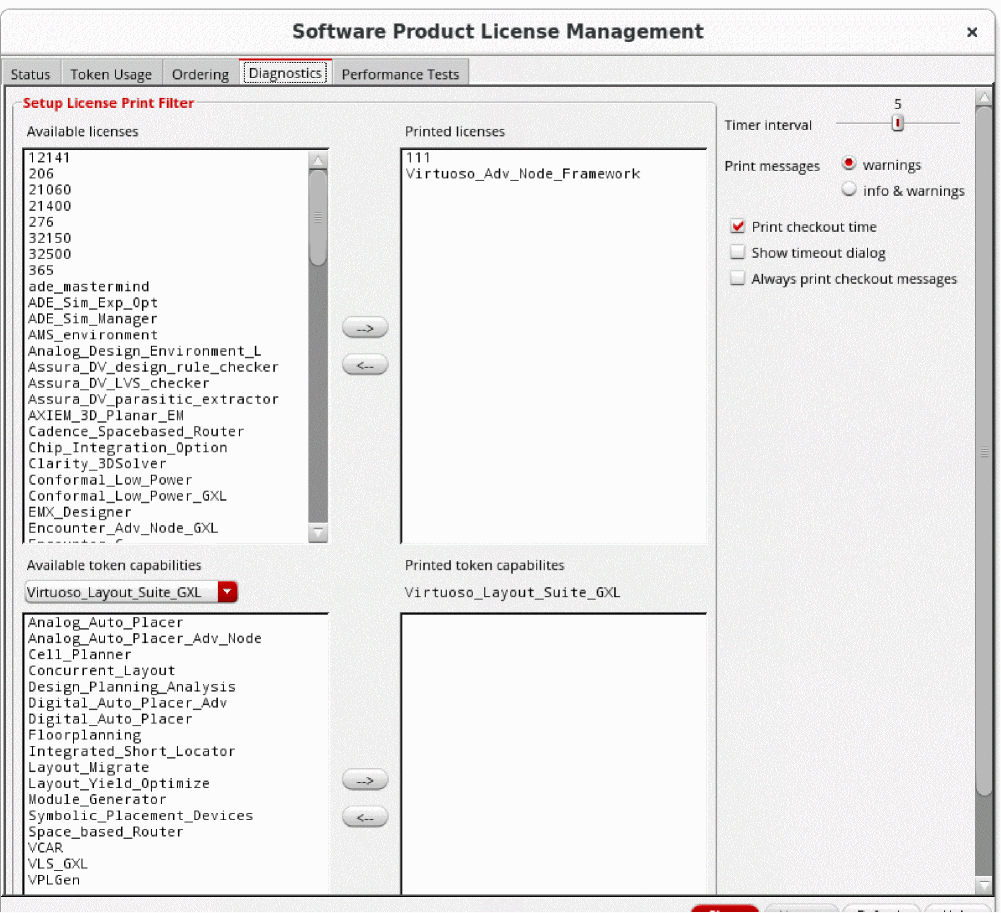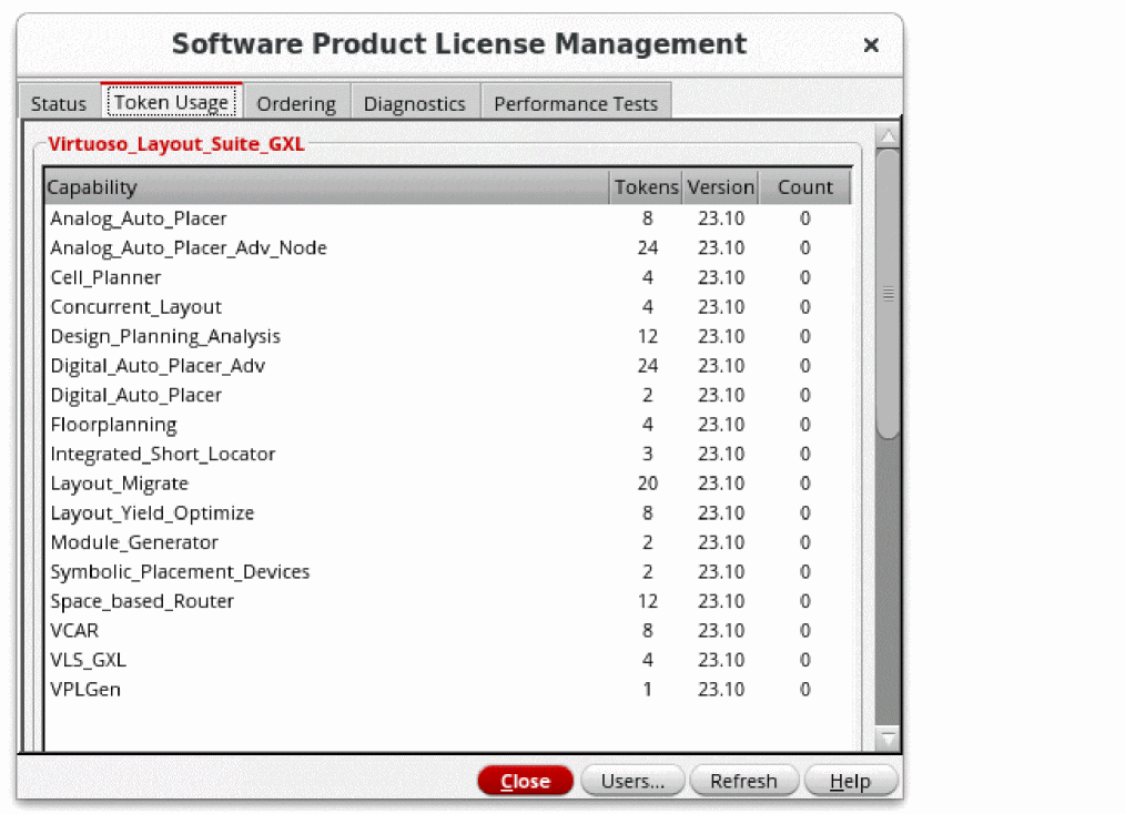 The Token Usage tab displays the number of tokens required to run each capability of the Virtuoso Layout Suite GXL and the respective usage status.