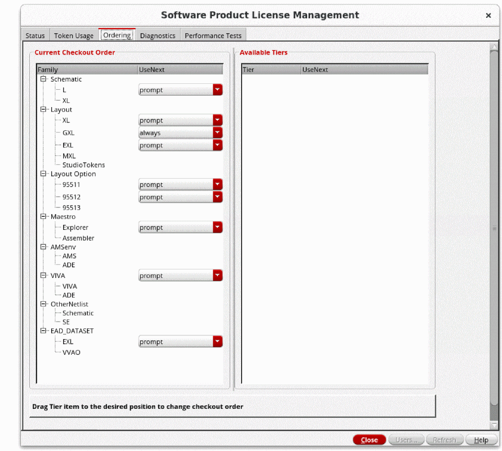 To change the checkout order of a product family, click and drag the required tier up or down to move it to the desired location.The GXL and EXL tiers in the Layout family cannot be separated; they must appear together in the checkout order.UseNext: Displays the UseNext setting, which controls whether to check out the next available license for Virtuoso tier-based applications when the license required for a requested application is not available.