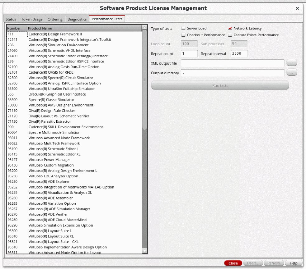 In such situations, you can run a diagnostic test from the Performance Tests tab to test the license checkout performance on a feature-by-feature basis and across each server. This tab is an interface to the perf_test utility.