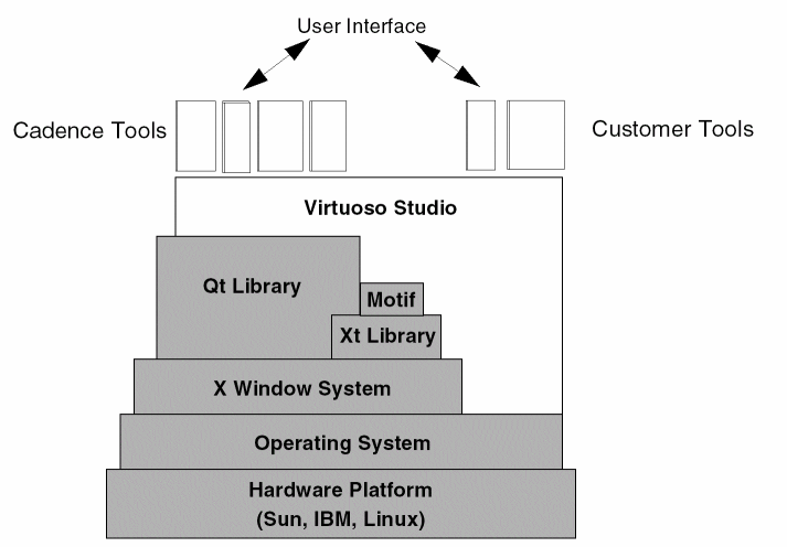 The figure below shows how the Virtuoso Studio resides on top of several layers of software (bottom layer is your hardware platform).