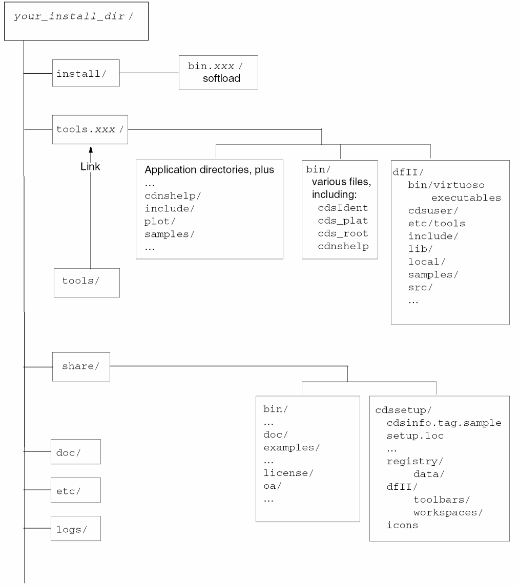 - Directory hierarchy for storing executables and data files - see Virtuoso Studio Design Environment Hierarchy and Setting the Installation Path for Cadence Tools for more information