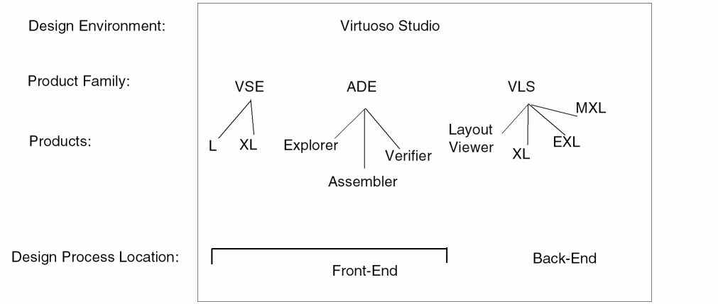 This platform provides a unified front-to-back design environment. The front-end design environment consists of Virtuoso Schematic Editor® (VSE) and ADE product families. The back-end consists of the Virtuoso Layout Suite® (VLS) product family.