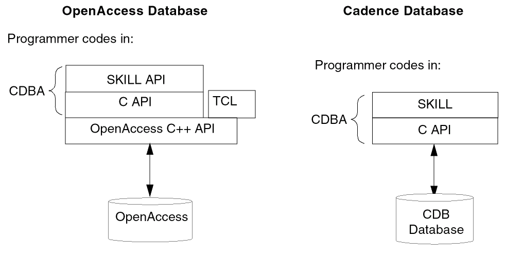The acronym CDB (Cadence Database) refers to the physical Cadence proprietary database, which previously was the only database that was supported for use with Virtuoso applications. The acronym CDBA (Cadence Database API) refers to the C and SKILL procedural interface extended to work on both CDB and OpenAccess. Previously implemented on Cadence proprietary technology, CDBA is now implemented on top of the OpenAccess database and has been significantly expanded to offer direct access to many new native OpenAccess objects.