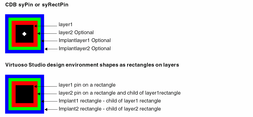 A CDB syPin or syRectPin can be made up as a one layer pin or as a two layer pin and can optionally have implant layers. These pins are converted to shapes as rectangles with pins.