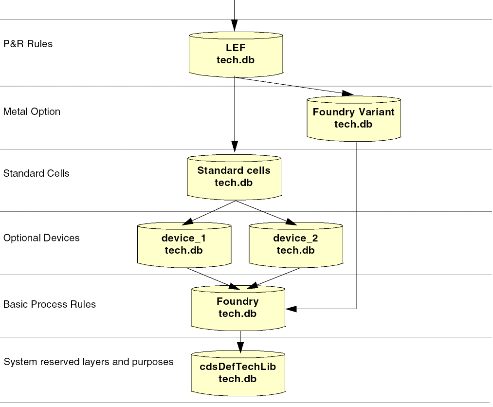 In the following example, the LEF technology database, referenced by the Design Library, references two technology databases, the Foundry Variant technology database and the Standard Cell technology database. This means that the design constraints and process information in the referenced databases are applicable to the Design Library design. The Design libraries technology database is a derived technology database because it is, in effect, inheriting information from the technology databases that it references. Furthermore, both device technology databases reference the Foundry technology database, which references the default technology database. This chain of references is known as the technology database graph.