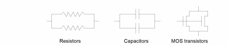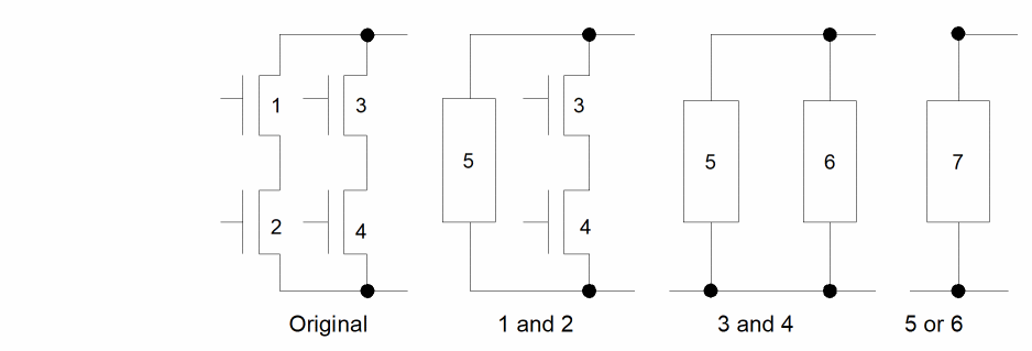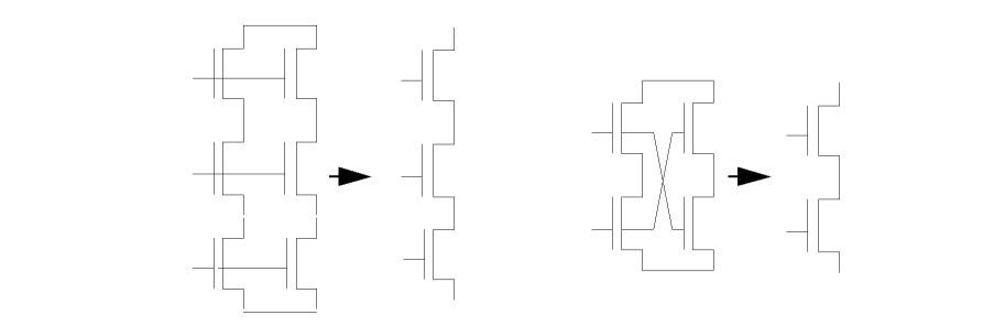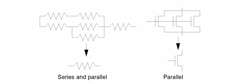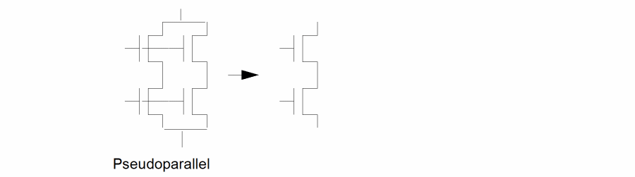 MOS reduction also implies parallel reduction plus reduction of pseudoparallel device combinations. In these cases, the devices are not truly connected in parallel but behave electrically as if they were.