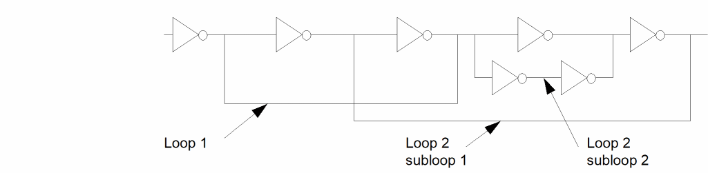 A loop is formed when the output of a gate can be traced, through inputs of other gates, back to the input of the original gate. ERC detects all loops, whether they are isolated, nested or crossing. Each loop is given a loop number and a subloop number. The subloop number is used when a single loop has multiple paths within it.