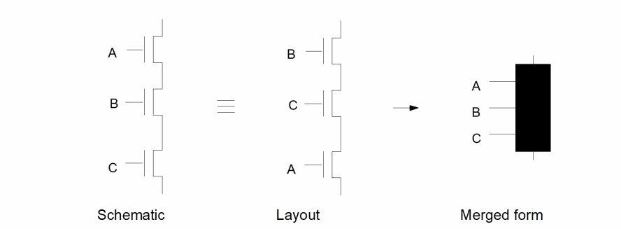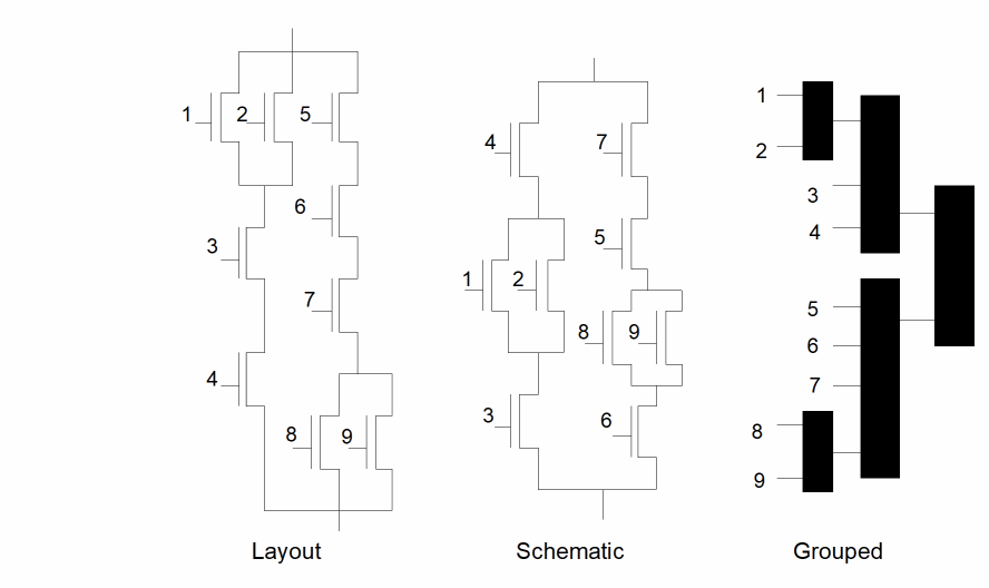 If the schematic has the original transistors in the order A-B-C and the layout has them in the order B-C-A, the comparison of the circuits fails. The MOS grouping process combines the three separate transistors into a single device with three permutable terminals. With this single device, the terminal ordering doesn’t matter and the layout device matches the schematic device, which causes the original devices to match.