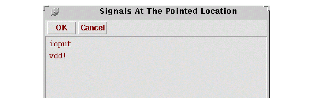 If you select a net with the mouse, you might pick up the substrate, the well, or some other global layer if those layers are left active. If more than one net appears under the cursor, a list box appears as shown below listing all the nets. Click on a net and select OK.