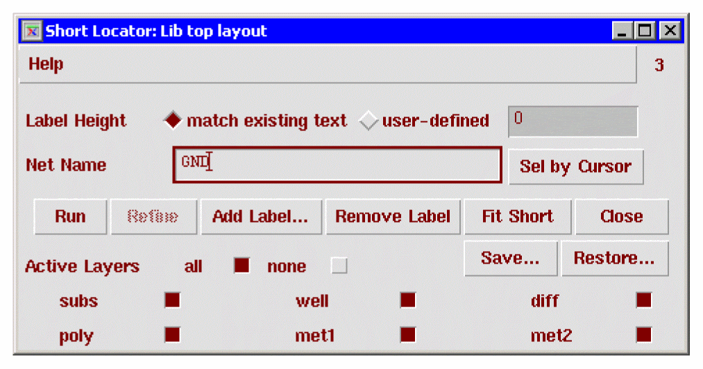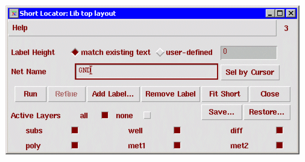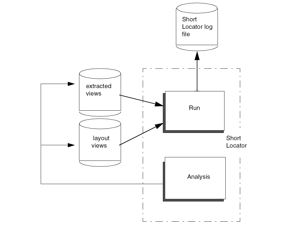 Short location uses the interconnect polygons and contacts that form the net. Short Locator analyzes the shorted net using all labels associated with the net. It assumes that the section of the shorted net under the label is part of the net defined by that label. Using these labels, the program determines which parts of the shorted net belong to one net, and which belong to another. Any part of the net that could belong to more than one label contains a short.