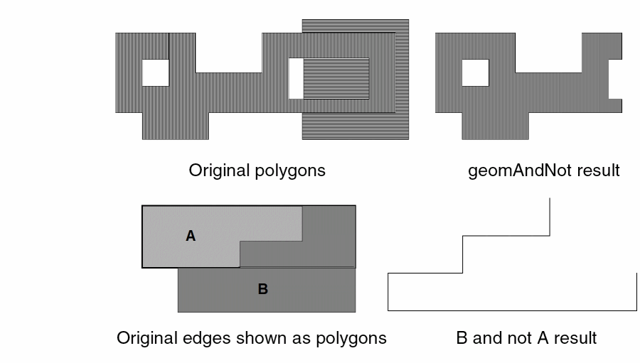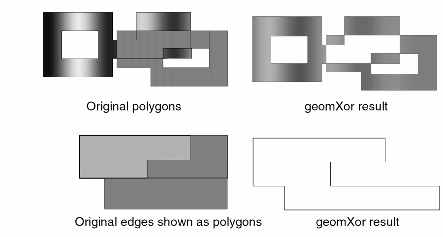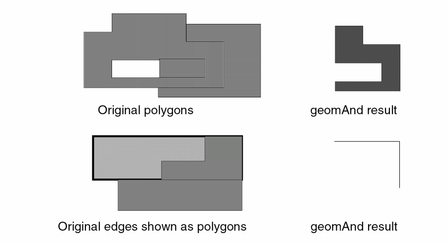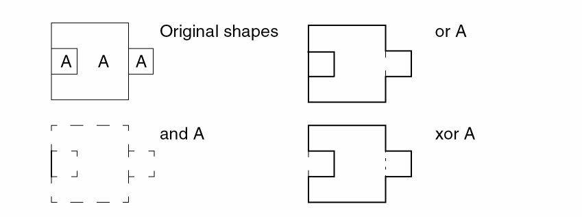 Wherever possible the results of edge boolean operations are based on the result of the equivalent shape boolean operations. For example, an and command between shapes will not have a result if the shapes do not overlap. Similarly, the and command between edges will not have a result if the edges came from shapes which did not overlap. An edge xor is considered to be the same as an edge or minus an edge and.