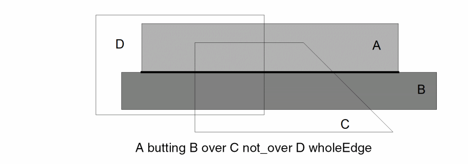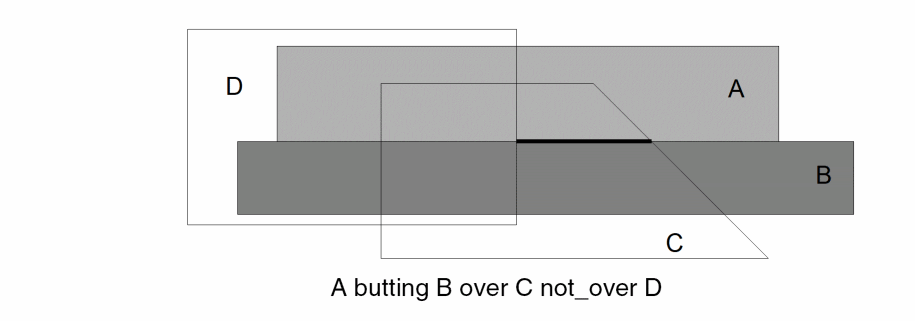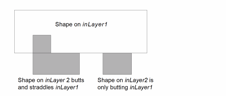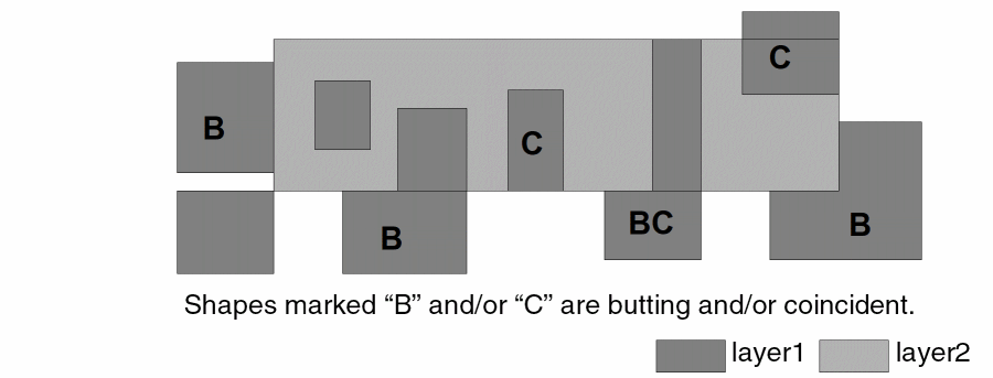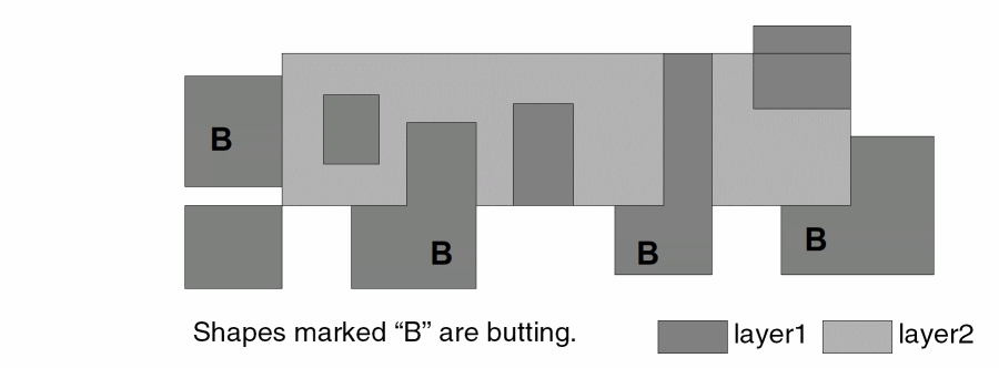 - The command geomButtOnly( A B exclusive ) selects a shape on layer A only if all shapes on layer B that interact with it have a butting-only relationship.