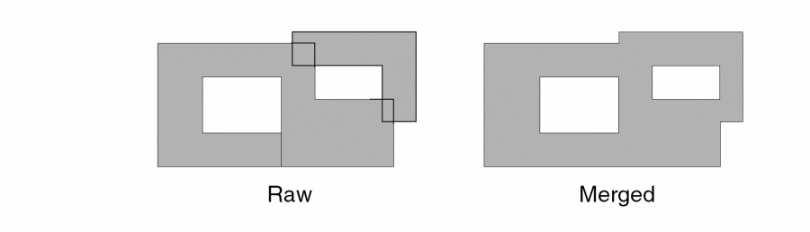 Most layer processing commands generate merged data. This means that Diva merges overlapping and butting shapes on the same layer into single shapes and also removes construction edges. The resulting shapes have edges that form an interface between the inside and outside of the shape. If you use merged data during verification, processing is simplified and spurious errors are eliminated.