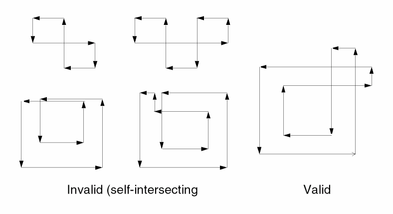 The following figure illustrates five shapes, four of which are self-intersecting. Note that some edges are drawn close together rather than coincident, so that the point at which the edges cross is not hidden. Also, the shapes are not shaded, since shading depends upon the concept of “inside” and “outside.”