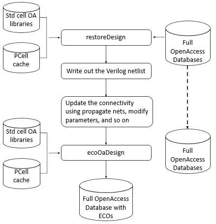 Note: If the old library/cell/view have no PCells, that is, it is a digital-only netlist, you can use the standalone utilityoa2verilogdirectly. The Innovus commandsrestoreDesignandsaveNetlistare required if PCells are present in the design. - Edit the Verilog netlist manually to implement the digital ECO changes.