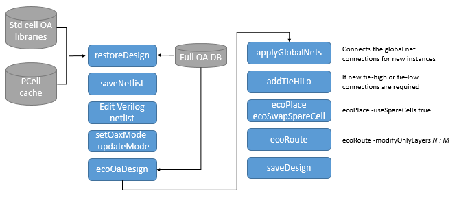 ecoOaDesignwith the-postMaskoption to read the new ECO Verilog netlist, which copies all of the floorplanning, placement, routing and spare bit marking, from the pre-ECO OpenAccess database. - Run the
