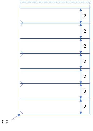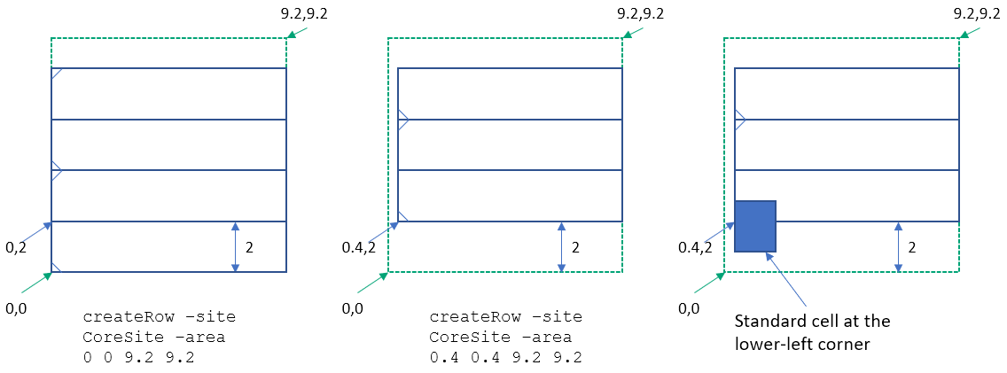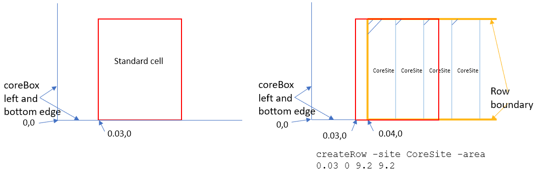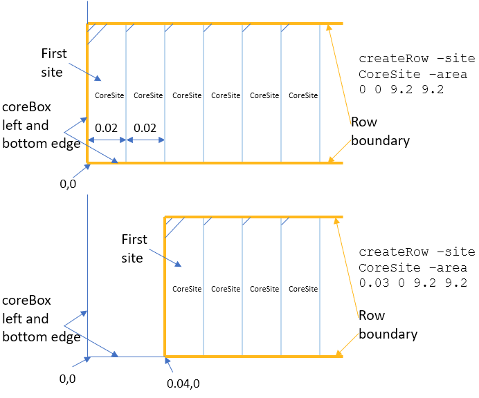 The following diagram explains how the bottom edge of the first row is determined by the createRow command. Let us assume the x and y coordinates of the lower-left corner of coreBox is 0,0, the row height is 2, and the site width is 0.02: